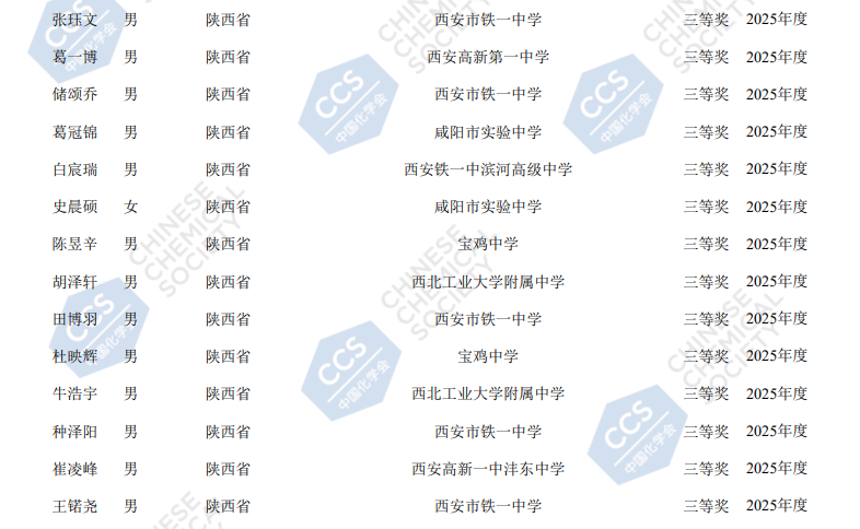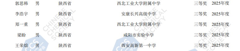 2025陕西赛区第39届化学竞赛初赛省三获奖名单