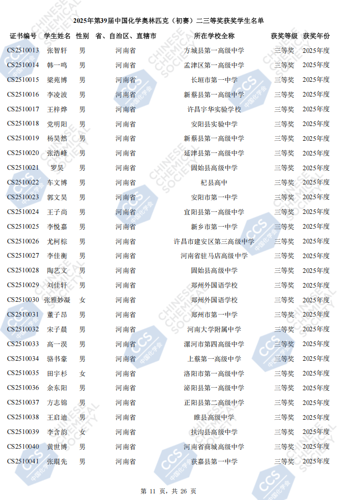 2025河南赛区第39届化学竞赛初赛省二获奖名单