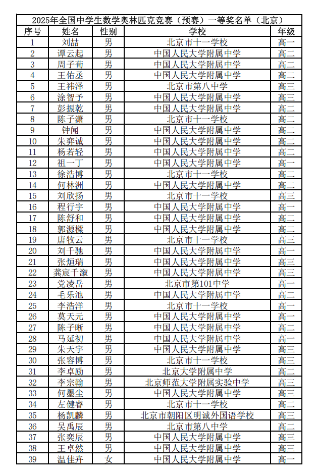 2025年第41届全国高中数学竞赛联赛省队、省一获奖名单已经公布,北京高考在线整理了2025第41届高中数学联赛北京赛区省一获奖名单,希望对考生有所帮助。