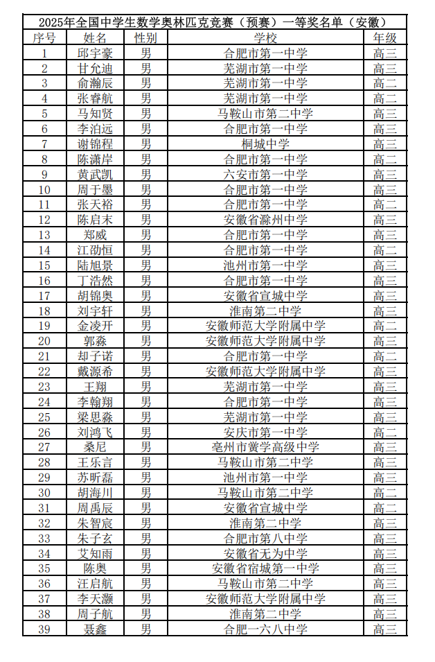 2025年第41届全国高中数学竞赛联赛省队、省一获奖名单已经公布,北京高考在线整理了2025第41届高中数学联赛安徽赛区省一获奖名单,希望对考生有所帮助。