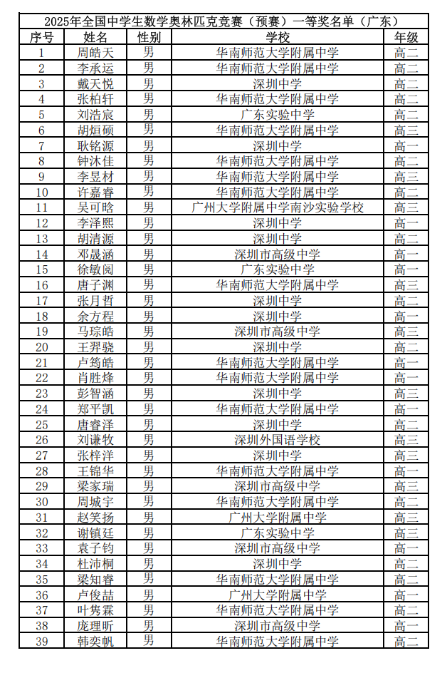 2025第41届高中数学联赛广东赛区省一获奖名单
