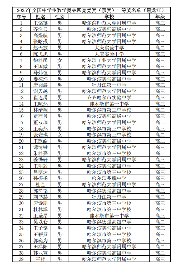 2025第41届高中数学联赛黑龙江赛区省一获奖名单