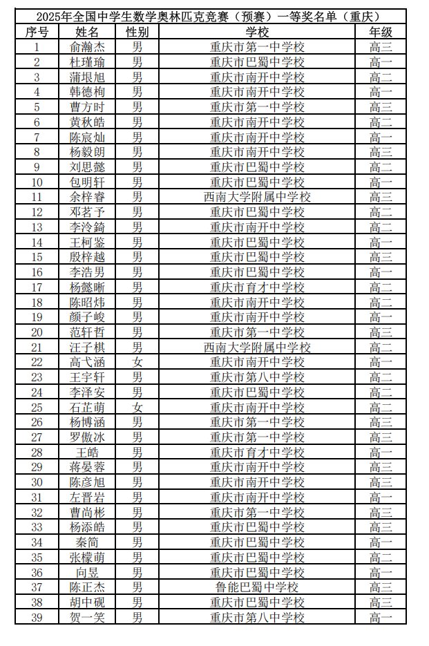 2025年第41届全国高中数学竞赛联赛省队、省一获奖名单已经公布,北京高考在线整理了2025第41届高中数学联赛重庆赛区省一获奖名单,希望对考生有所帮助。