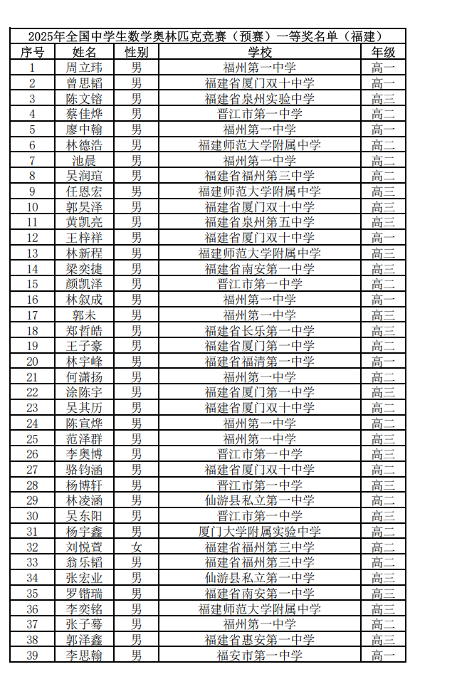 2025第41届高中数学联赛福建赛区省一获奖名单