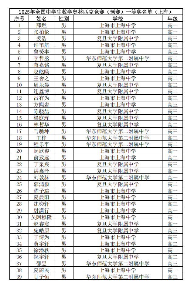 2025年第41届全国高中数学竞赛联赛省队、省一获奖名单已经公布,北京高考在线整理了2025第41届高中数学联赛上海赛区省一获奖名单,希望对考生有所帮助。