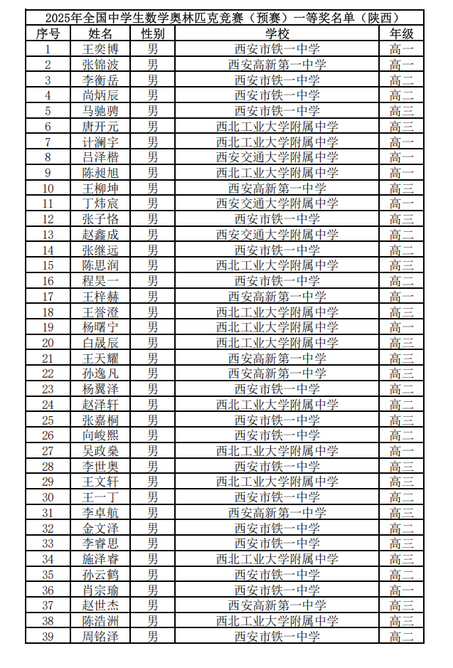 2025年第41届全国高中数学竞赛联赛省队、省一获奖名单已经公布,北京高考在线整理了2025第41届高中数学联赛陕西赛区省一获奖名单,希望对考生有所帮助。