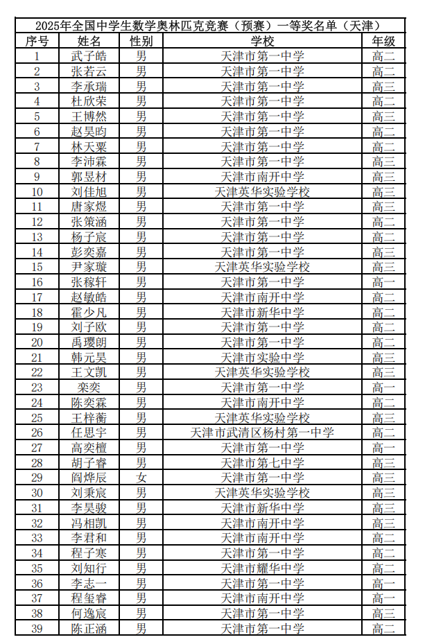 2025年第41届全国高中数学竞赛联赛省队、省一获奖名单已经公布,北京高考在线整理了2025第41届高中数学联赛天津赛区省一获奖名单,希望对考生有所帮助。