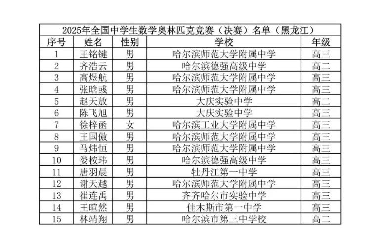 2025年第41届全国高中数学竞赛联赛省队、省一获奖名单已经公布,北京高考在线整理了2025第41届高中数学联赛黑龙江赛区省队获奖名单,希望对考生有所帮助。