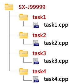 答案文件夹的子文件夹为题目文件夹(以每道题的英文名称命名),程序源文件将放置于题目文件夹下,程序源文件同样以题目英文名称命名且必须以.cpp为扩展名。(假设准考证号为SX-J99999,4道题目分别为task1、task2、task3和task4,则目录结构如下图)