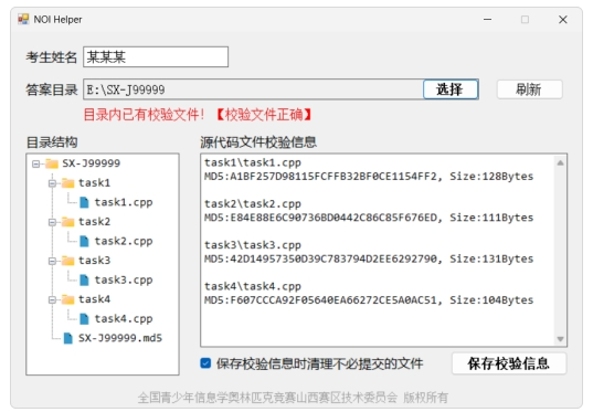 在NOIHelper中输入姓名、选择答案目录后,点击“保存校验信息”将会在答案文件下生成一个以准考证号命名、扩展名为.md5的文件(上图所示已生成)。