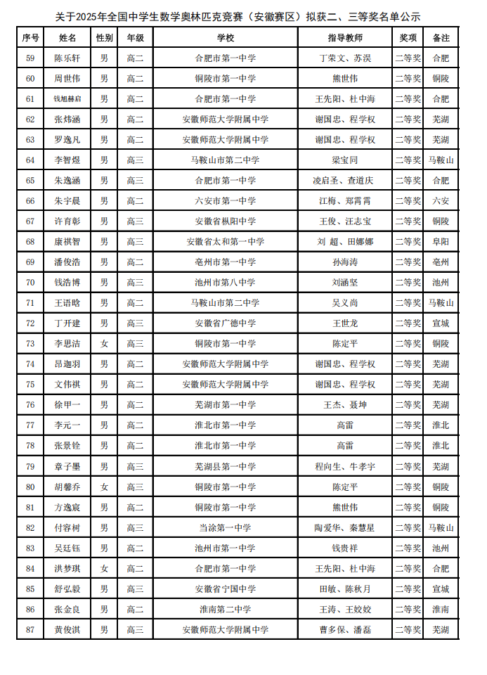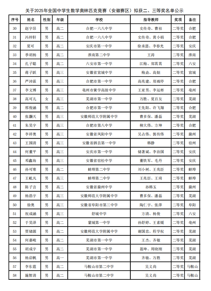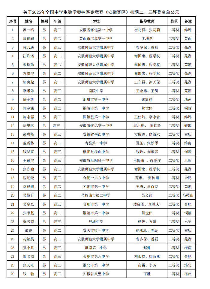 2025第41届高中数学联赛安徽赛区省二获奖名单