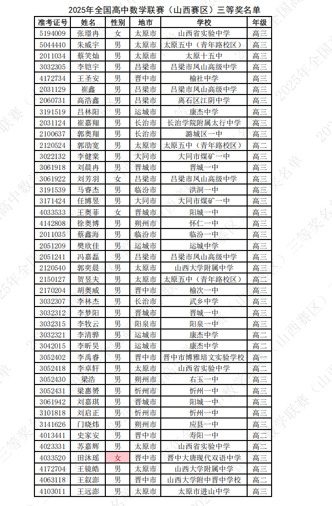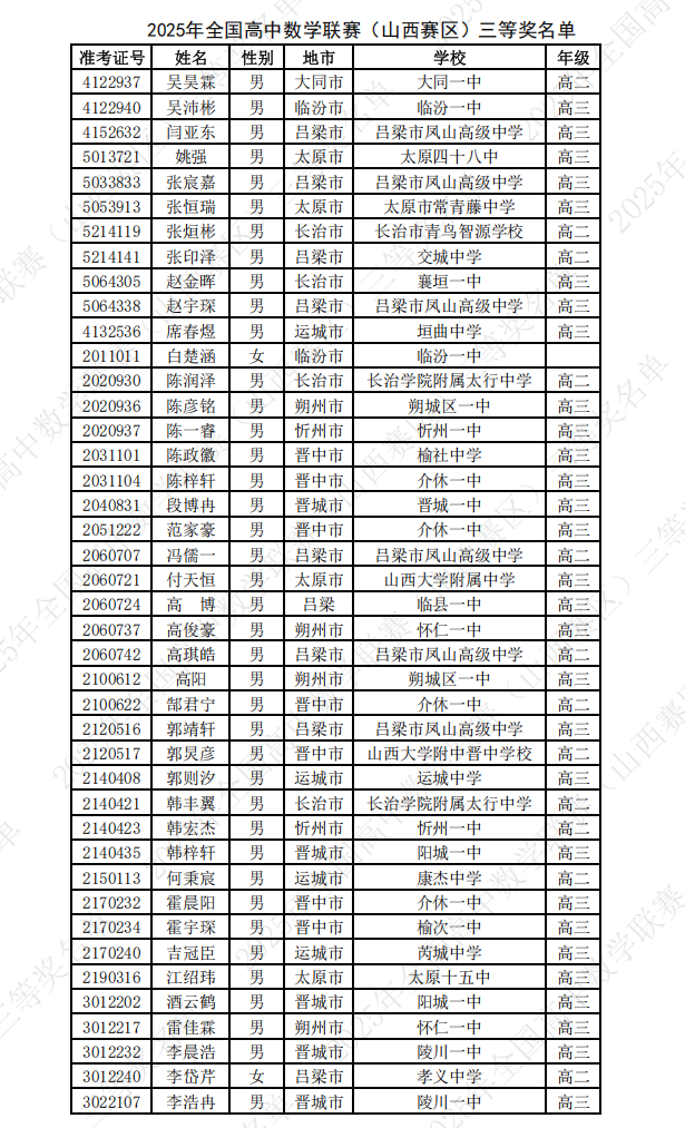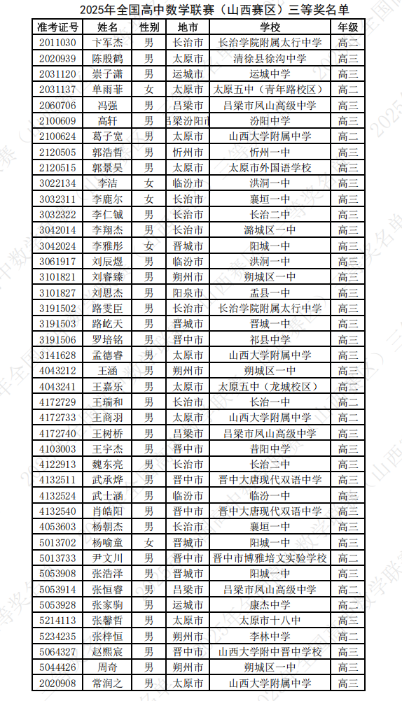 2025第41届高中数学联赛山西赛区省三获奖名单