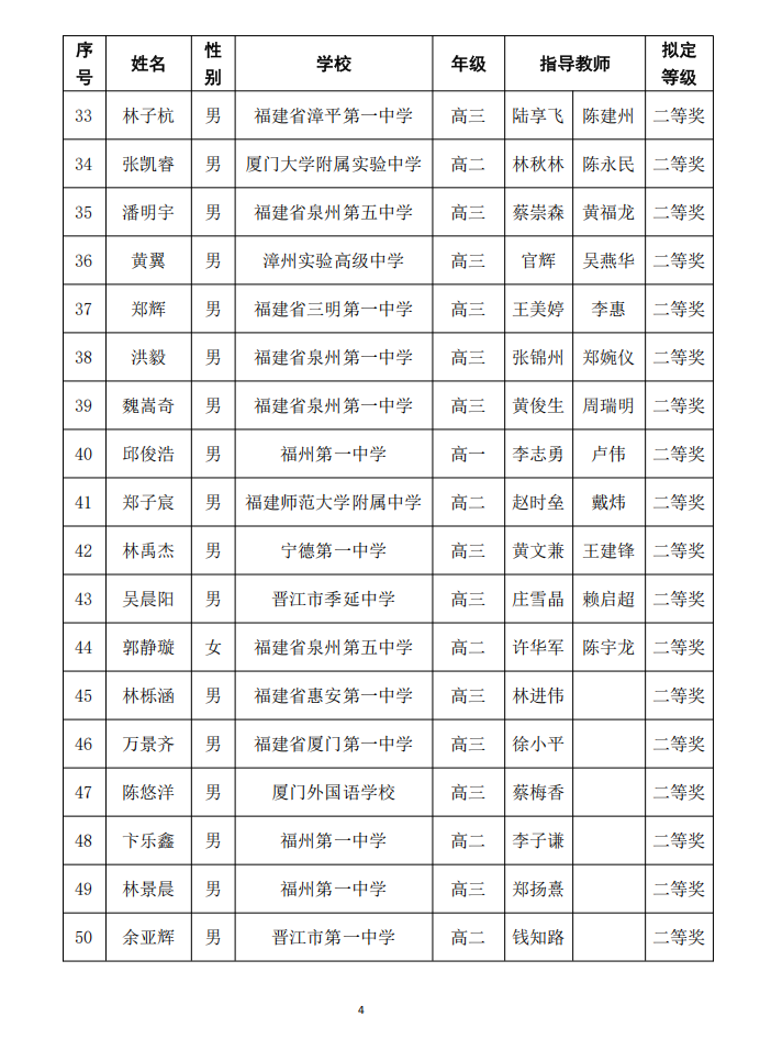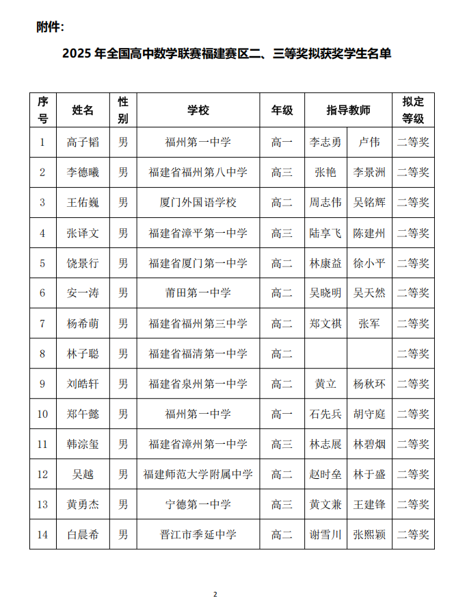 附件:2025 年全国高中数学联赛福建赛区二、三等奖拟获奖学生名单