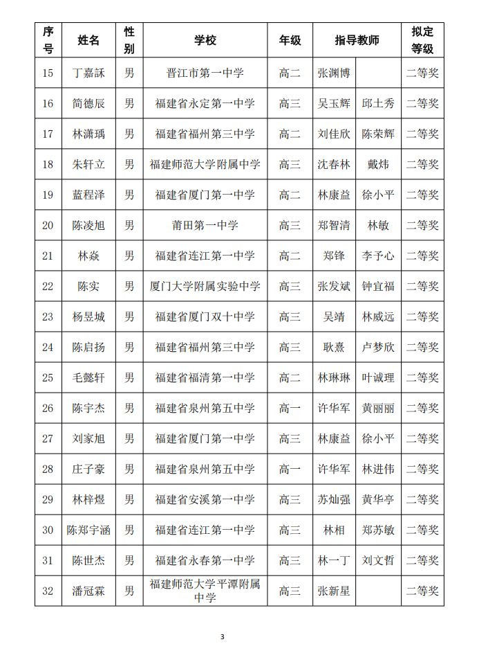 根据全国高中数学联赛组织委员会“关于2025 年全国中学生数学奥林匹克竞赛(初赛)暨 2025 年全国高中数学联赛复评结果的通知”,现将 2025 年全国中学生数学奥林匹克竞赛(预赛)暨 2024 年全国高中数学联赛福建赛区二等、三等奖拟定获奖学生名单进行公示(名单见附件)。