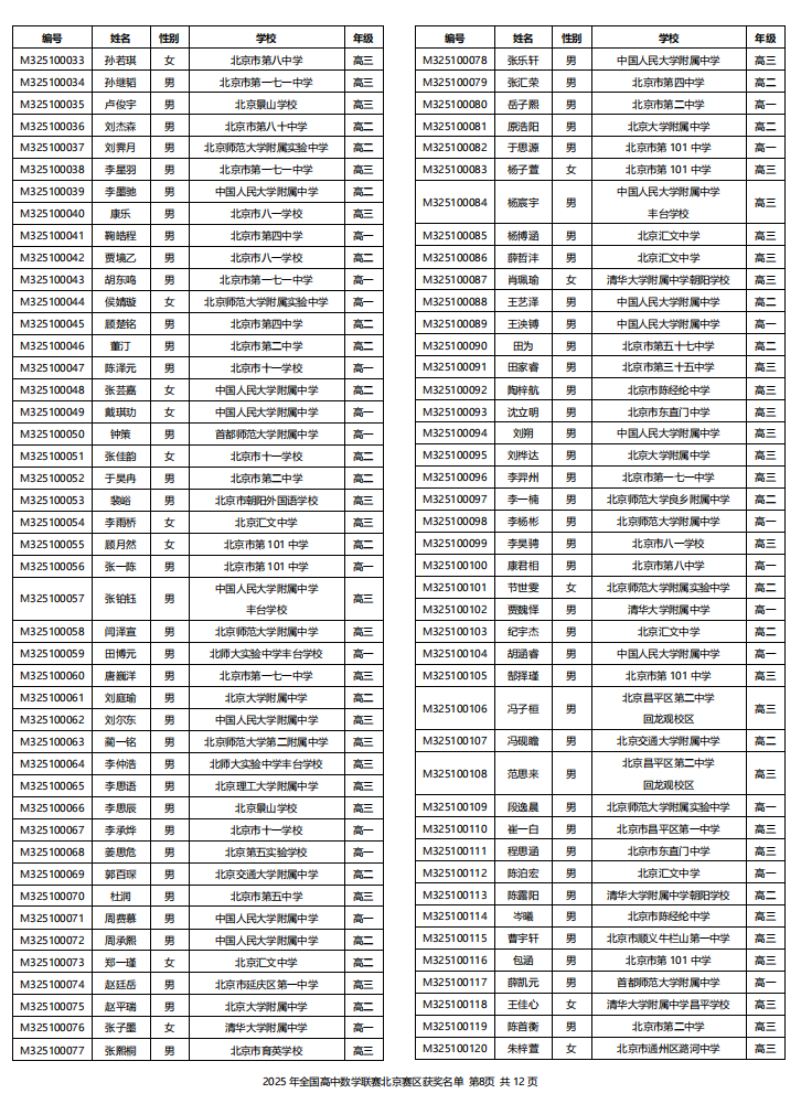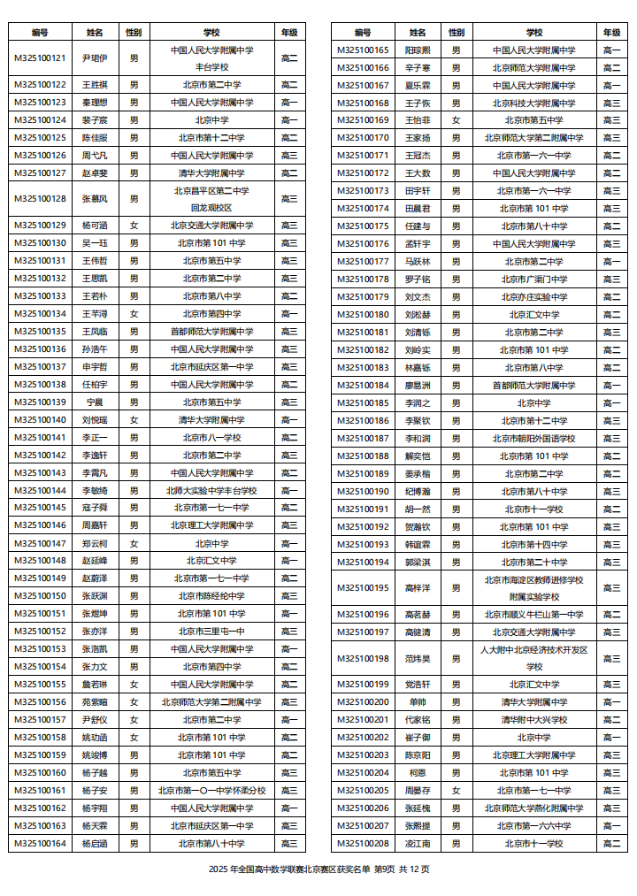 2025第41届高中数学联赛北京赛区省三获奖名单