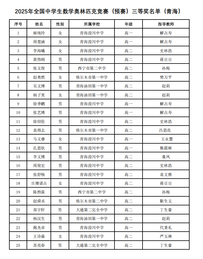 2025第41届高中数学联赛青海赛区省三获奖名单