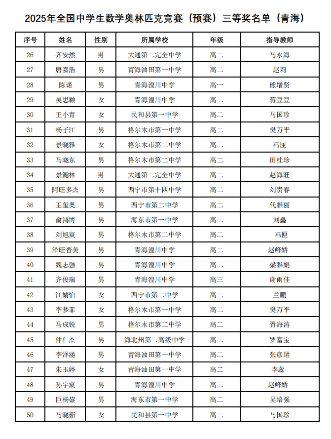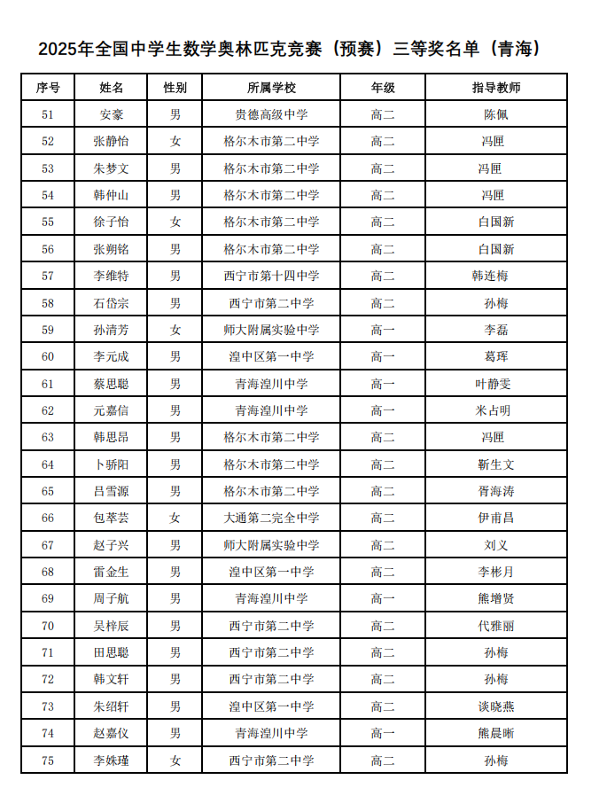 2025第41届高中数学联赛青海赛区省三获奖名单已经公布,北京高考在线整理了2025第41届高中数学联赛青海赛区省三获奖名单,希望对考生有所帮助。