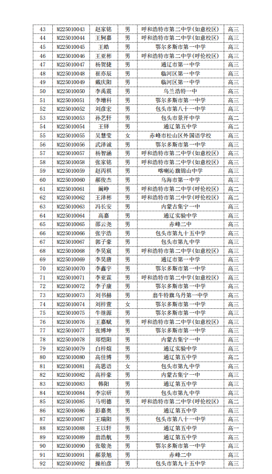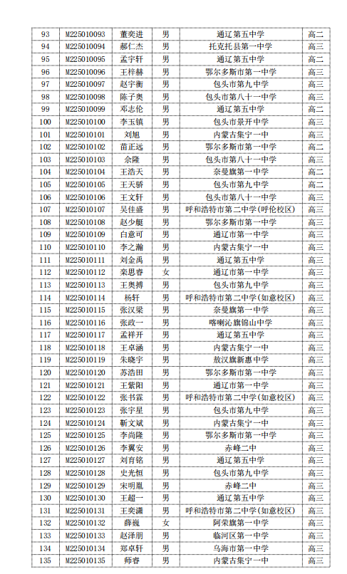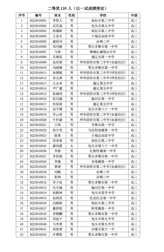 2025第41届高中数学联赛内蒙古赛区省二获奖名单(135人)