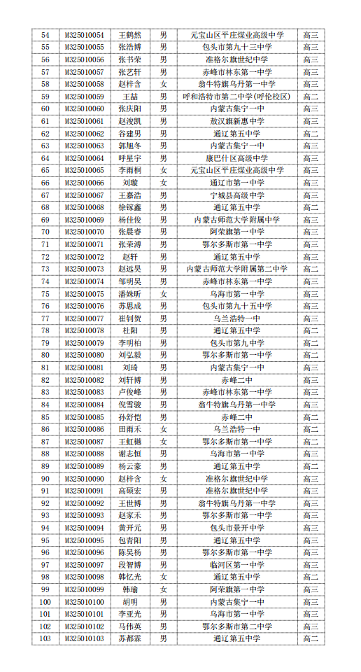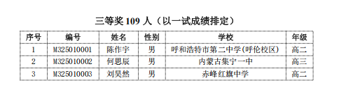 2025第41届高中数学联赛内蒙古赛区省三获奖名单(109人)