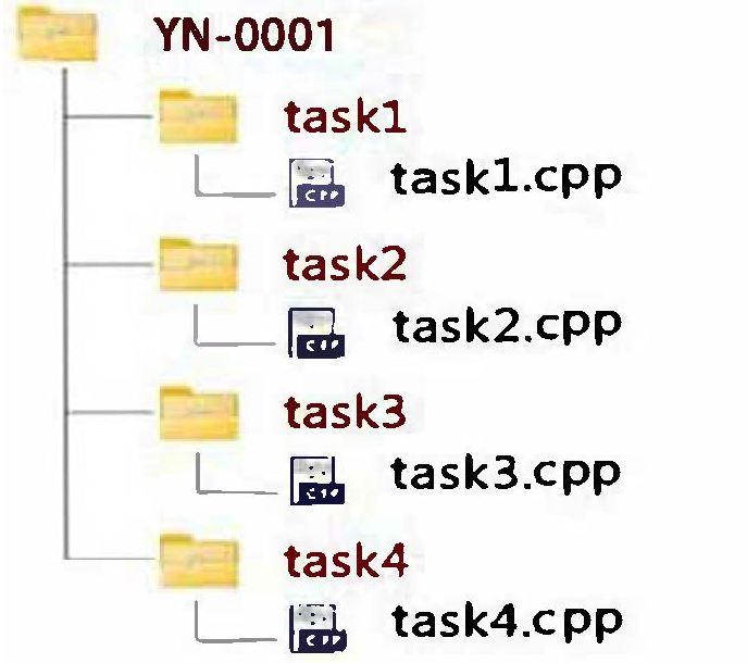 6. 所有选手需按照NOIP规范建立以准考证号命名的文件夹,下级子文件夹名称为每道题的英文名,子文件夹内仅包含程序源文件(xxx.cpp)。在选手答案目录下,请选手将提交的用于测评的全部文件(源代码、有关答案等)直接放在以自己的考号命名的目录下以题目英文名称命名的子目录中。以选手YN-0001,4道题目分别为task1、task2、task3和task4为例,答案目录的储存结构为:
