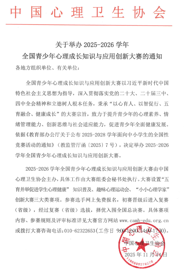 2025-2026学年全国青少年心理成长知识与应用创新大赛的通知