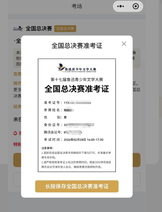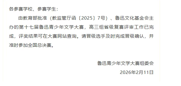 2026年2月10日10:00起,第十七届鲁迅青少年文学大赛高三组省级复赛获奖证书电子版开放下载;纸质版证书可自愿申领,申领通道同步启动。请及时登录系统进行相关操作。