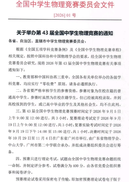 根据《全国五项学科竞赛条例》及《全国中学生物理竞赛章程》相关规定,按照中国科协和中国物理学会的要求,经全国中学生物理竞赛委员会研究,现将2026年第43届全国中学生物理竞赛有关事项通知如下,一起来看!