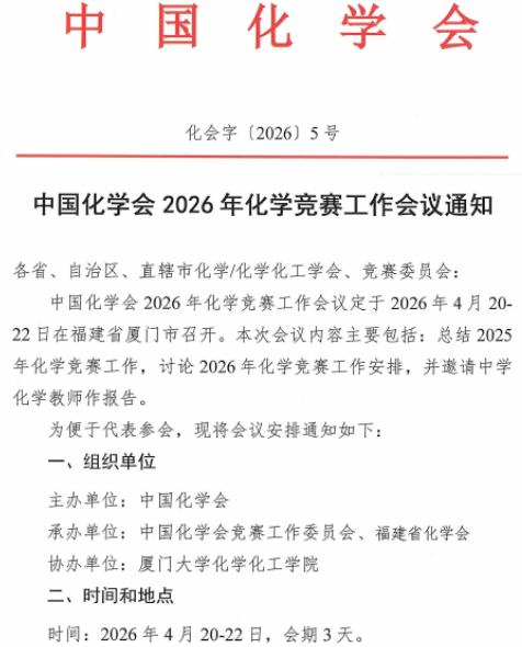 中国化学会2026年化学竞赛工作会议通知