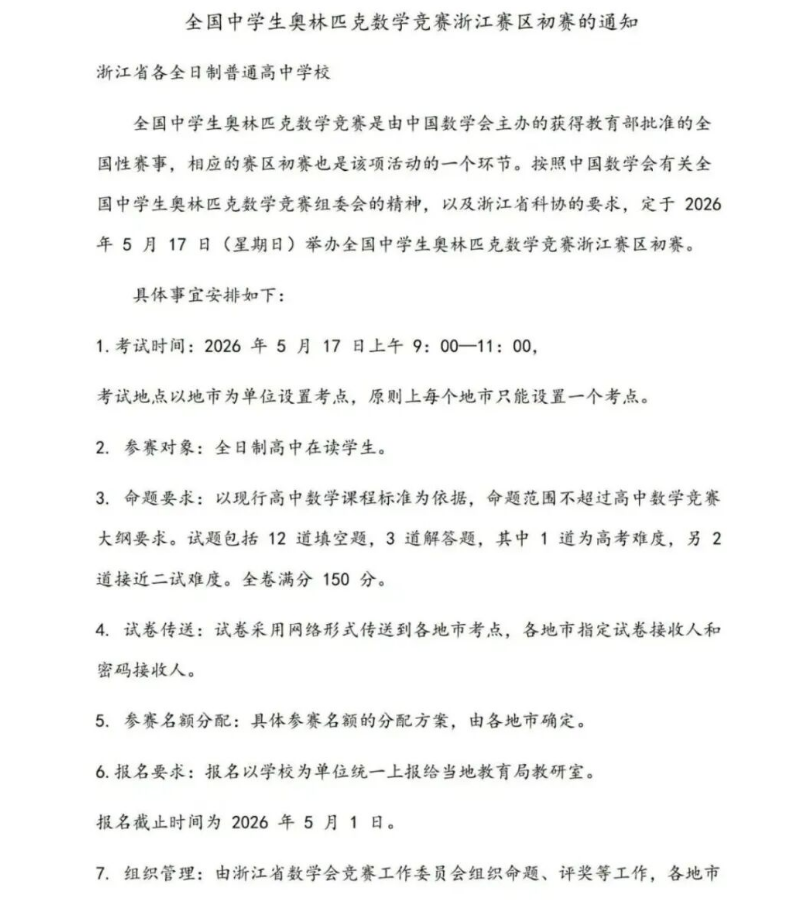 2026浙江赛区数学竞赛初赛,报名截止时间为2026年5月1日,考试时间为2026年5月17日上午9:00-11:00,北京高考在线整理了2026中学生数学竞赛初赛浙江赛区通知,希望对考生有所帮助。