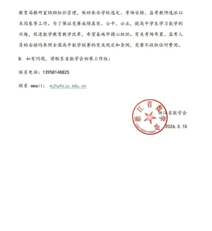 2026中学生数学竞赛初赛浙江赛区通知