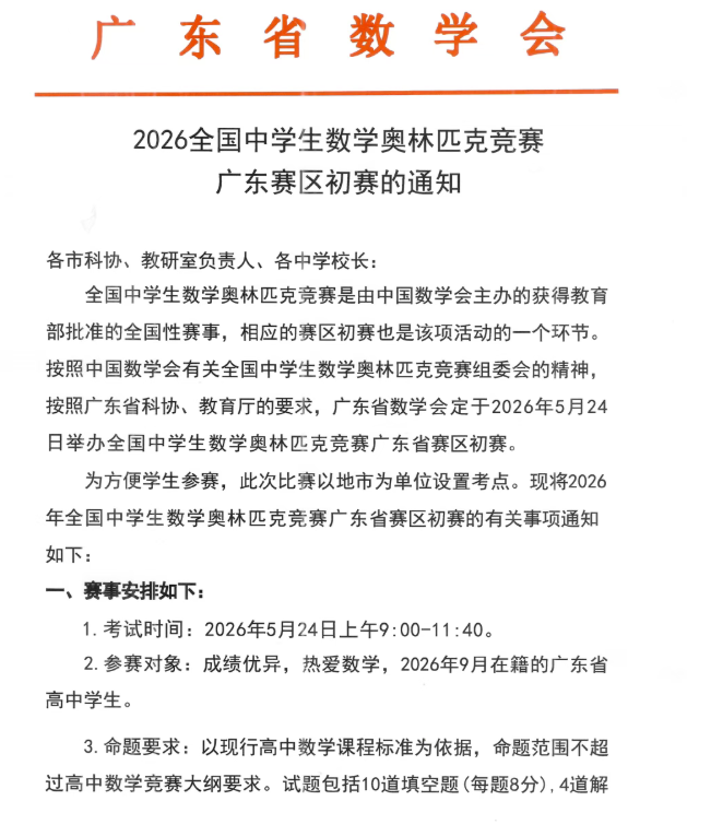 2026广东省数学竞赛初赛考试时间为2026年5月24日上午9:00-11:40,广东省数学竞赛的参赛对象为成绩优异,热爱数学,2026年9月在籍的广东省高中学生。北京高考在线整理了2026中学生数学竞赛初赛广东赛区初赛通知,希望对考生有所帮助。