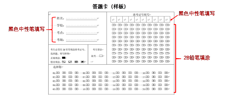- 本次考试全部采用选择题,阅卷方式采用机器自动批阅,答题卡中考生必须用2B铅笔填涂准考证号、选择题,用黑色中性笔填写姓名、学校、考点、考场和准考证号。要求考生必须准备好2B铅笔和黑色中性笔。