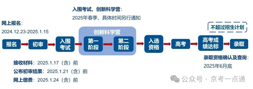 | 考试科目 | 入围考:数学、物理 科学营: 第一阶段(笔试):考查数理基础知识(数学、物理) 第二阶段:考查学习能力测试(笔试)、非智力因 素测试(面试+体测) 少年班:增设学习能力测试、科技阅读及写作 |