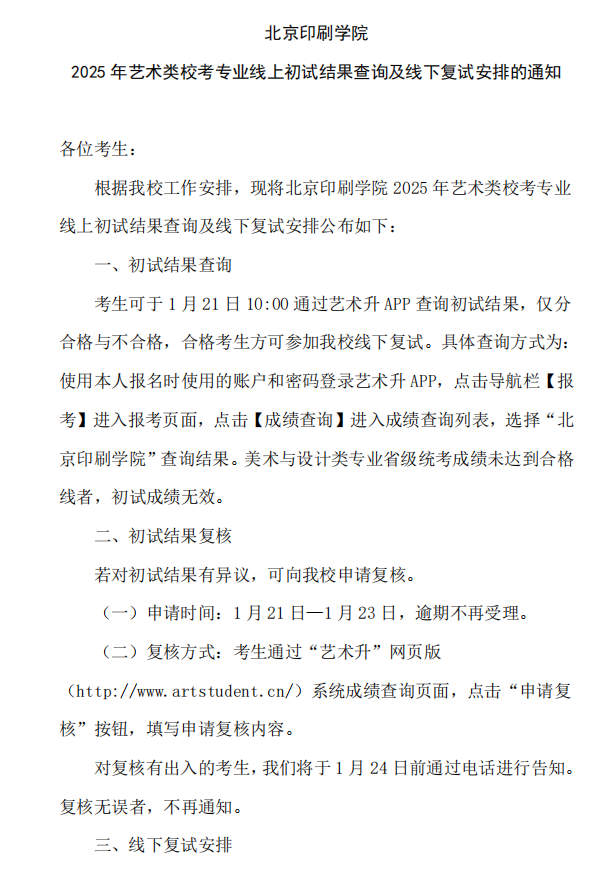 北京印刷学院 2025 年艺术类校考专业线上初试结果查询及线下复试安排公布,艺术类考生可于1月21日10:00 通过艺术升APP查询初试结果,北京高考在线团队整理了相关招生内容,详情如下: