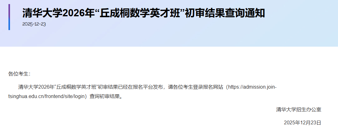 清华大学2026年“丘成桐数学英才班”初审结果公布,附初审结果查询入口