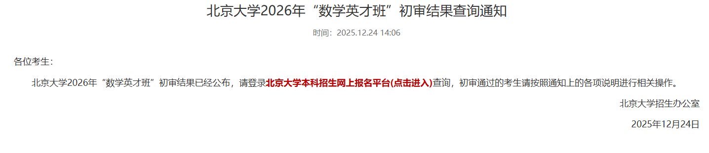 北京大学2026年“数学英才班”初审结果公布已公布,考生可登录报名系统查询初审结果,北京高考在线团队整理了相关内容如下: