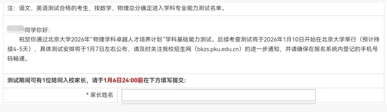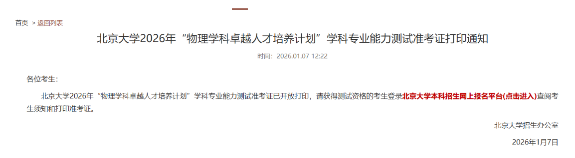 北京大学2026年物理卓越计划学科能力测试准考证打印通知,1月10日开考