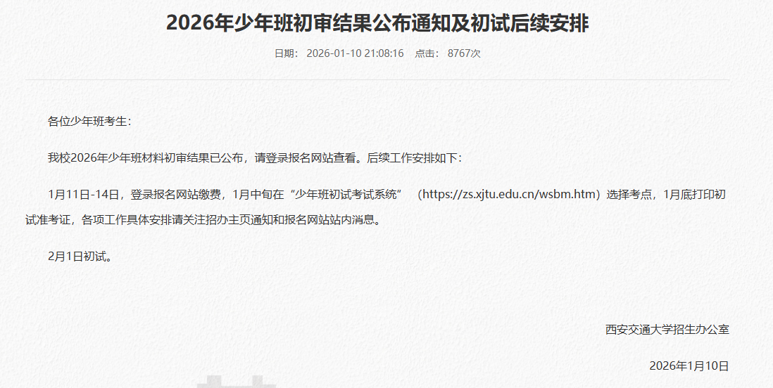 西安交通大学2026少年班初审结果出炉,1月11日-14日缴费,1月中旬选择考点,2月1日初试,后续校测详细安排是怎样?历年校测考什么?北京高考在线团队整理了相关内容: