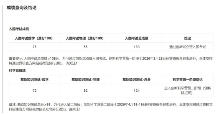 中国科学技术大学2026年少年班创新科学营第一阶段测试分数线