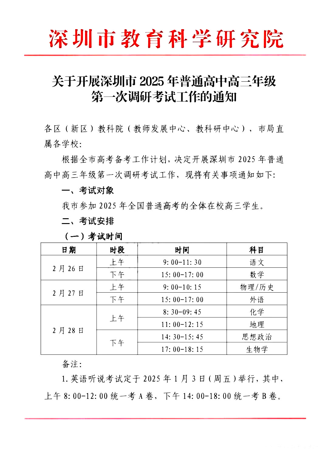 目前,北京高考在线团队搜集到了2025广东深圳一模各科考试时间安排,考试将于2月26日-28日进行,具体时间安排如下: