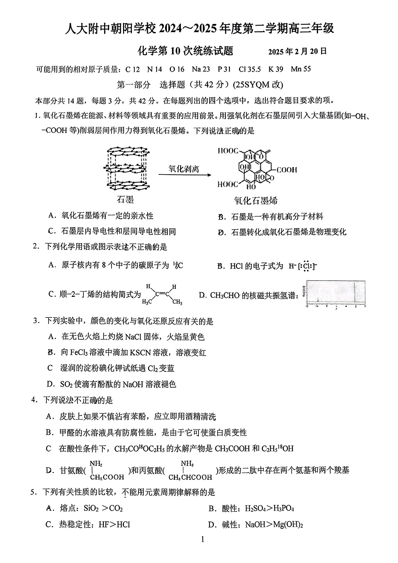 2025人大附中朝阳学校高三下学期统练十化学试题及答案