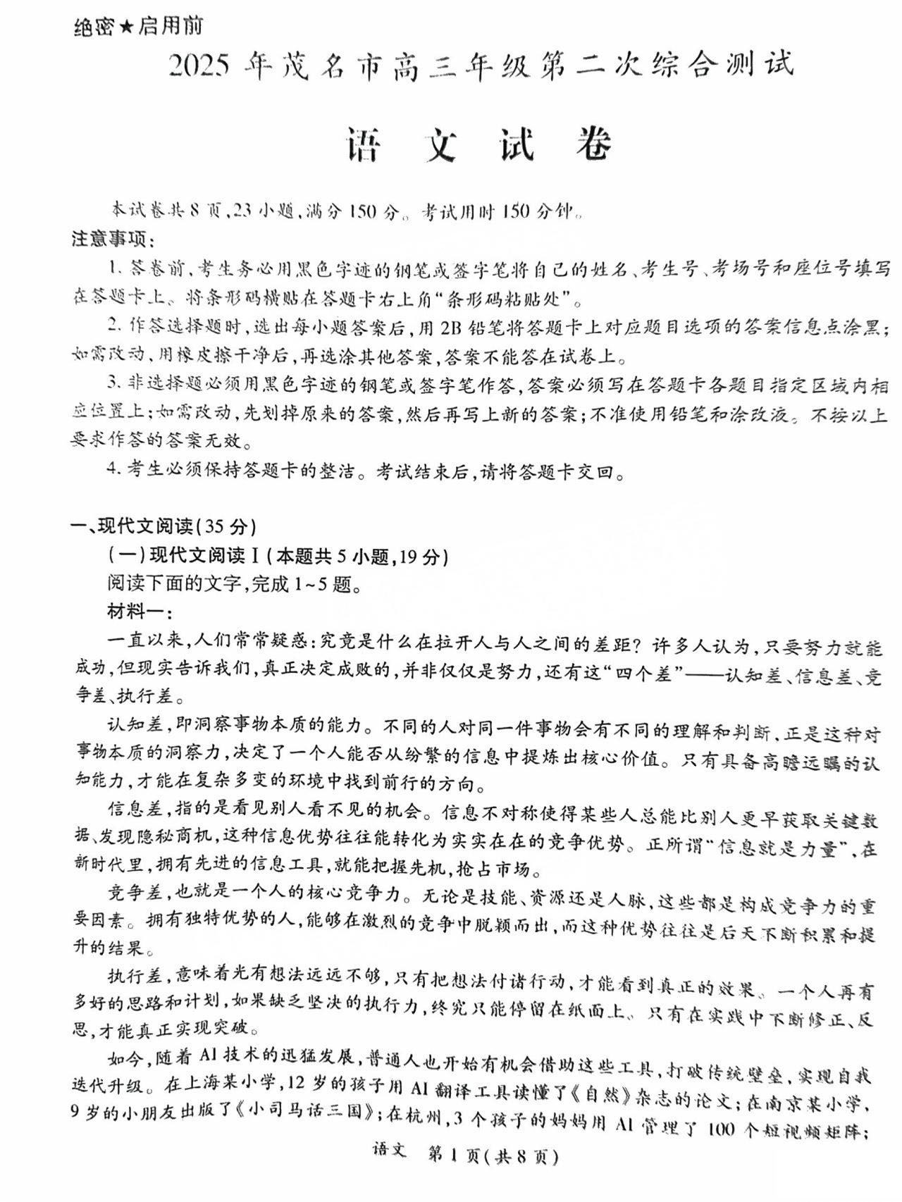 4.9-4.11日,2025广东茂名二模考试举行,北京高考在线团队整理了2025广东茂名二模语文试题及答案,想要练习的考生可以下载。