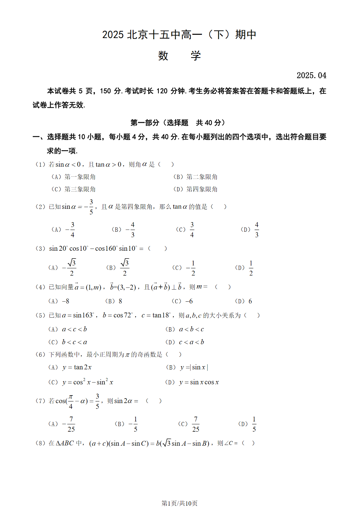 北京各区2024-2025学年高一、高二年级下学期期中考试陆续开考。为方便各位考生练习各区期中试题,北京高考在线团队将收集分享2025北京十五中高一下期中数学试题及答案,感兴趣的考生可以通过本文查看下载。