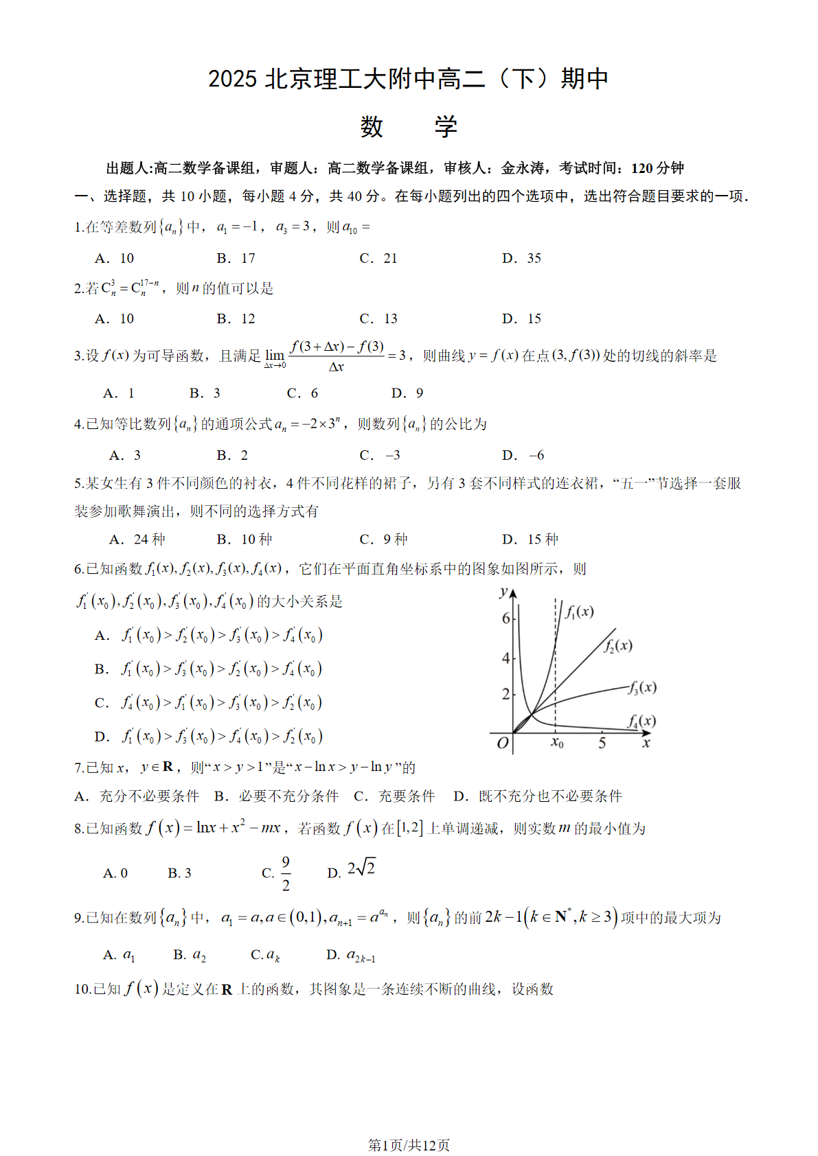 2025届各区高二年级下学期期中考试已陆续进行,为此,北京高考在线为考生整理了2025北京理工大附中高二下学期期中数学试题及答案,附PDF文件可下载!详情如下: