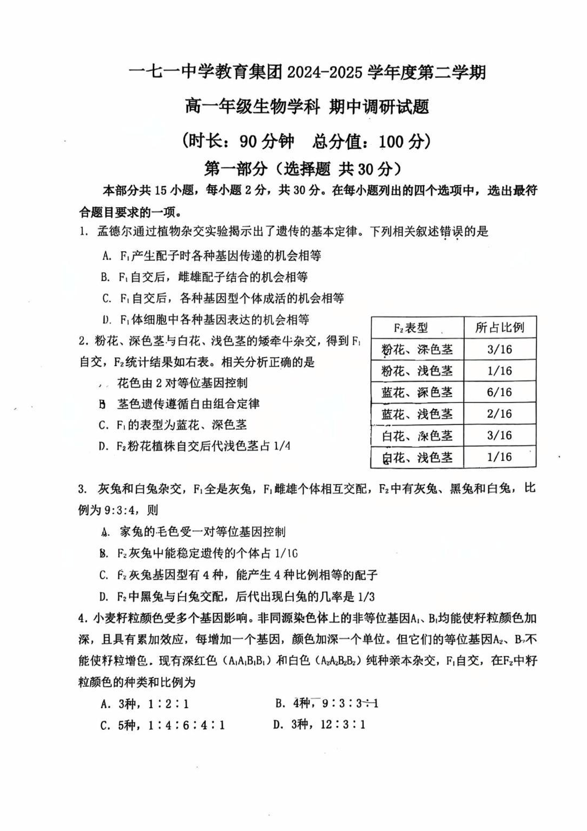 2024-2025学年北京一七一中高一下学期期中生物试题及答案