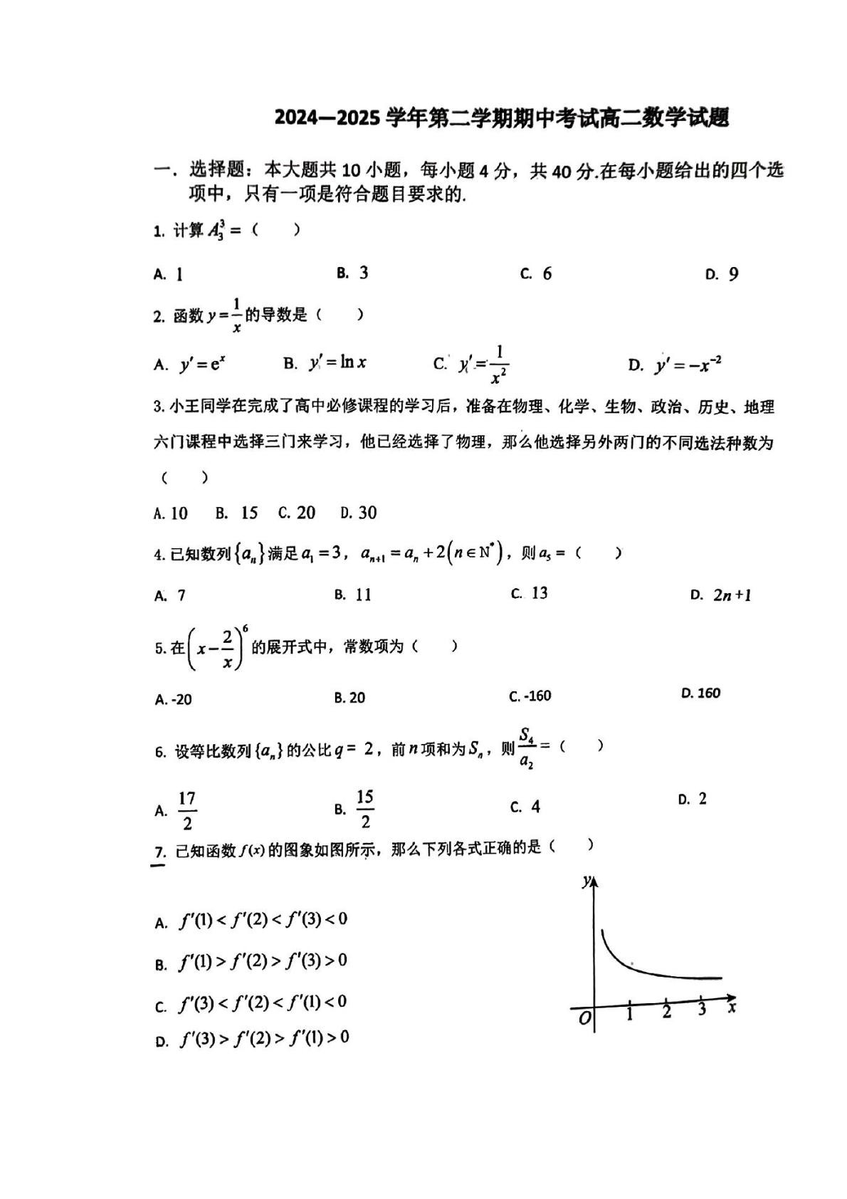 2024-2025学年北京十一学校顺义学校高二下期中数学试题及答案