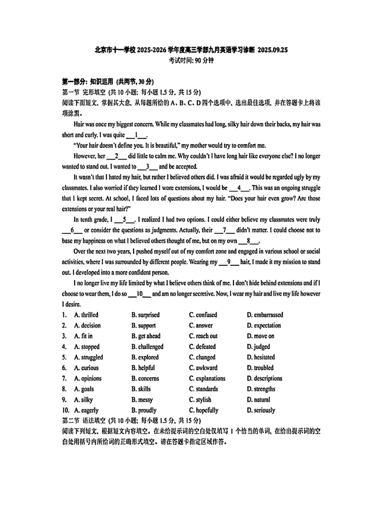 2025-2026学年北京十一学校高三9月月考英语试题及答案