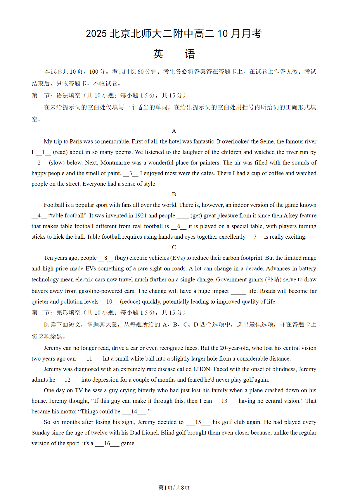 2025-2026学年北京北师大二附中高二10月月考英语试题及答案