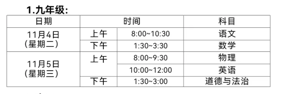 2025-2026学年北京各区初一、初二、初三年级期中考试将于10月底-11月初进行,北京高考在线团队收集到了2025-2026学年北京海淀区初三各科目期中考试时间安排,详情如下: