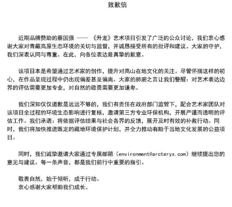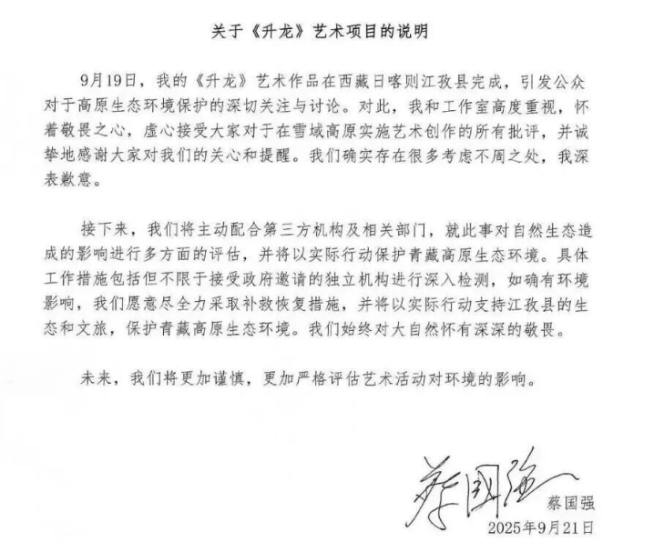 办方户外品牌始祖鸟已删除视频并公开致歉,承诺将配合第三方机构开展生态影响评估并实施补救措施。蔡国强工作室也发文道歉,表示将积极配合评估和保护青藏高原生态环境。蔡国强以爆破艺术闻名,曾主导北京奥运会“大脚印”焰火表演。此次项目再度引发公众对艺术创作与生态保护之间平衡的讨论。